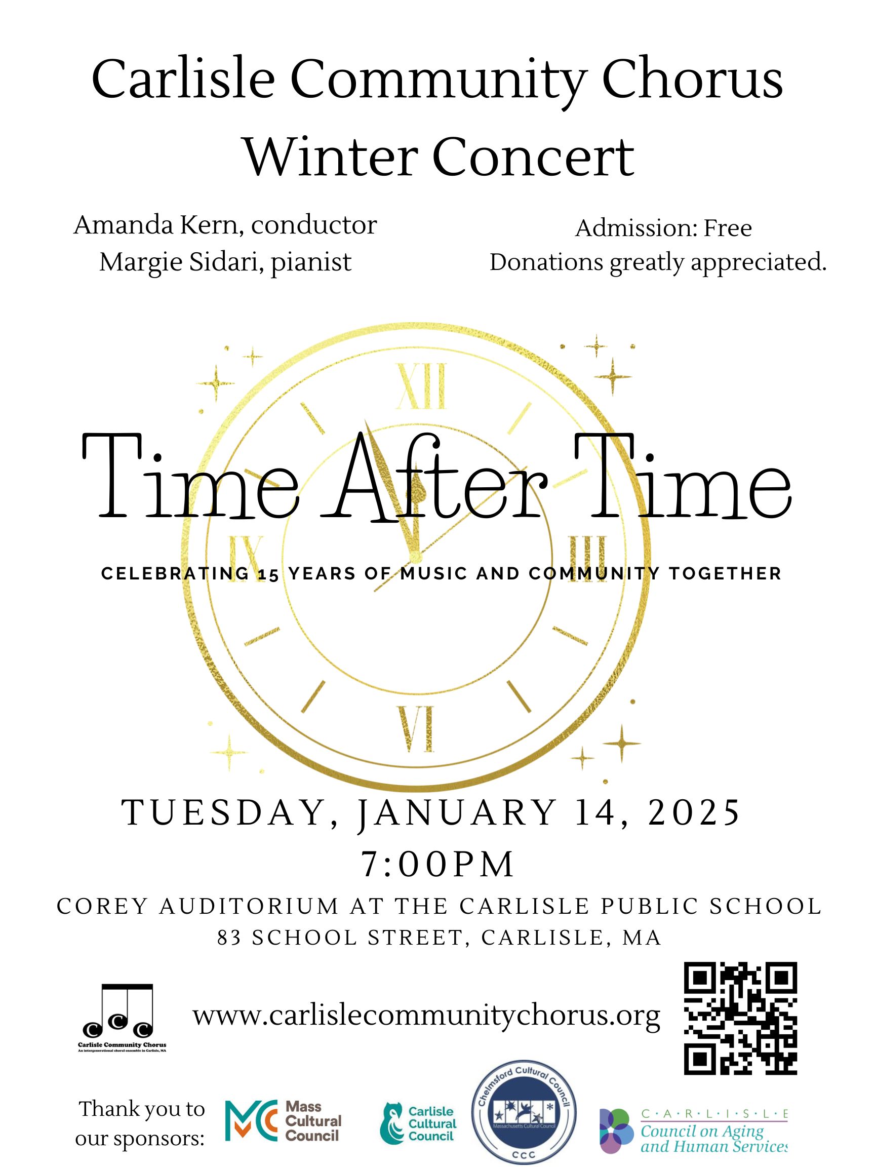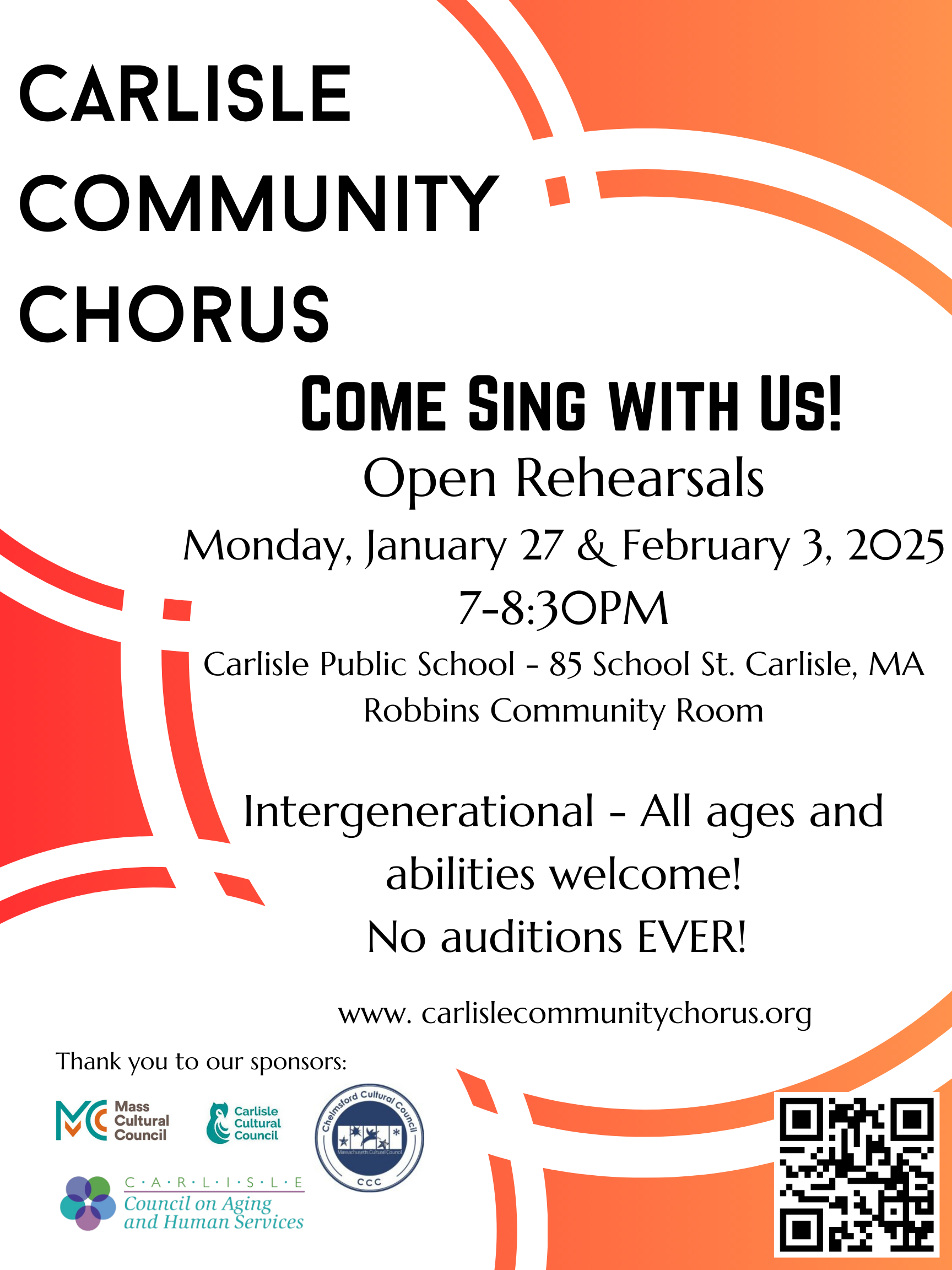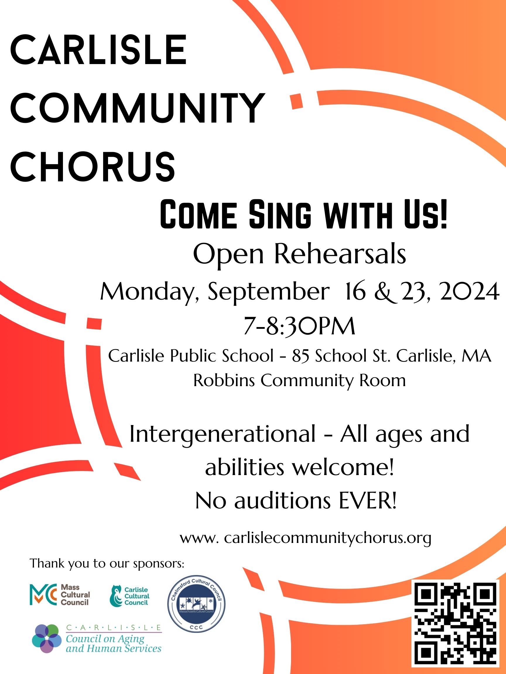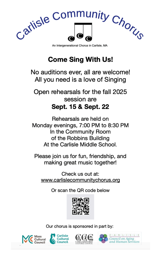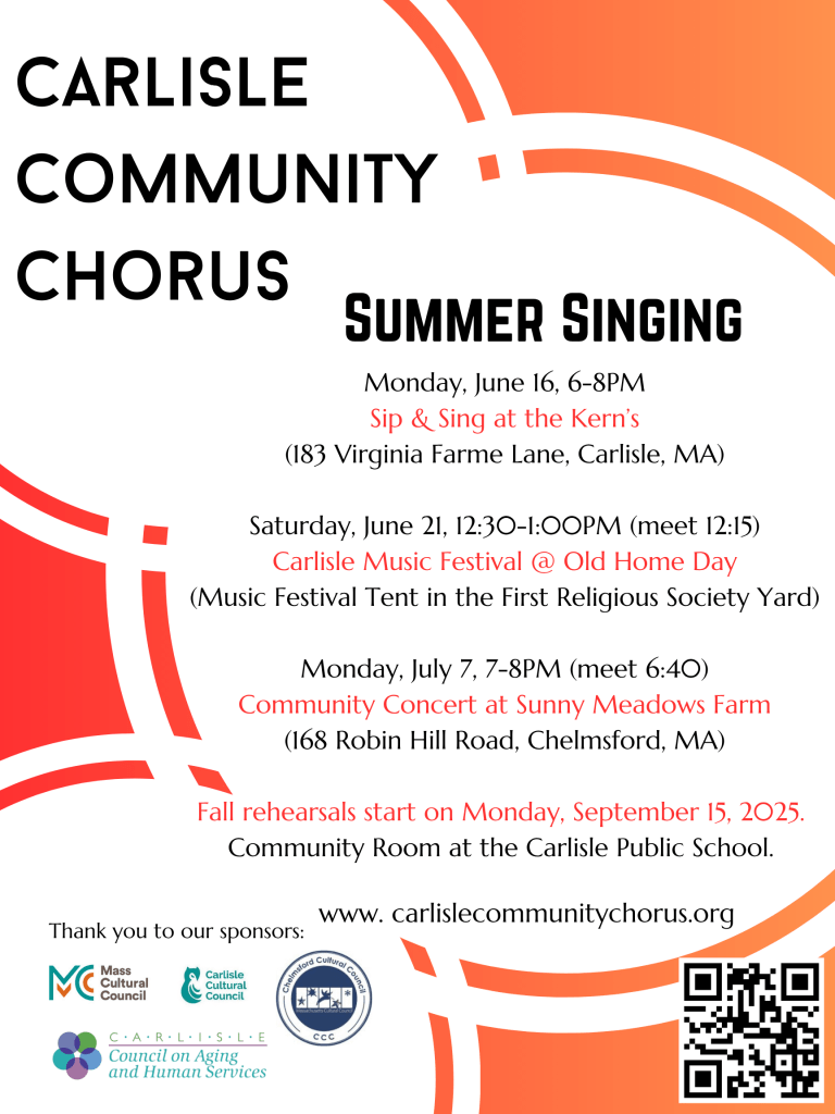 The Carlisle Community Chorus meets on Monday evenings from 7-8:30PM in the Community Room at the Carlisle Public School. All ages and abilities welcome – no auditions required. If you are interested in joining us we will be starting our fall season September 18, 2023. Please sign up for our mailing list, join our Facebook Page for specific details to be released over the summer.