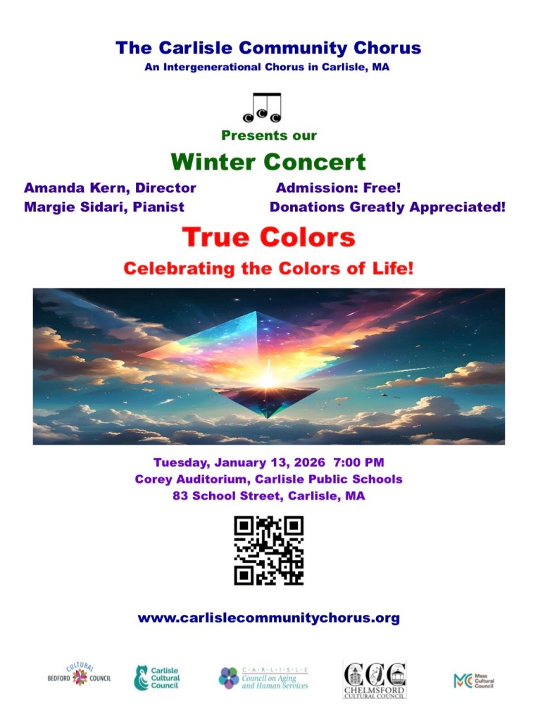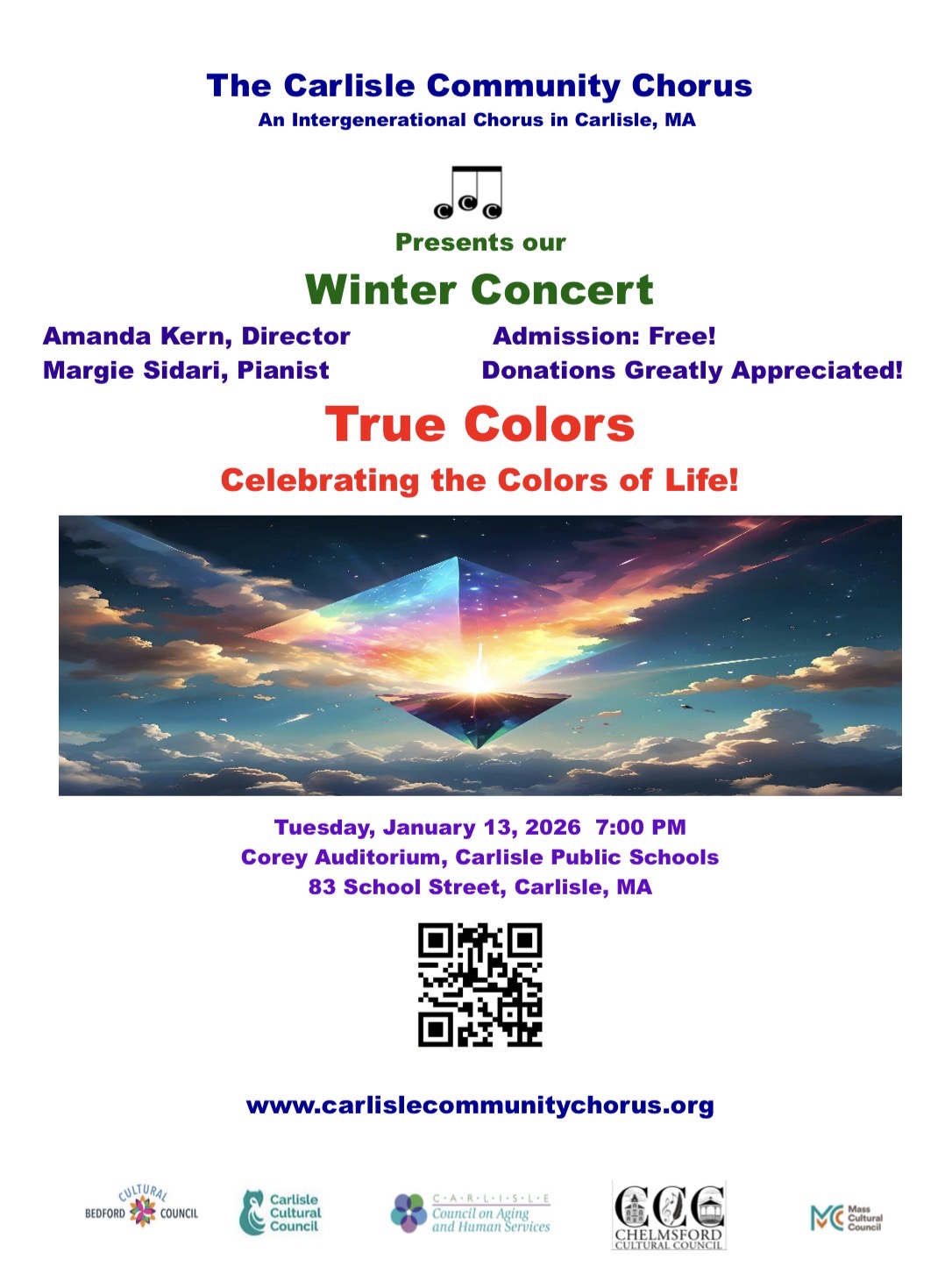 The Carlisle Community Chorus is about to let their “True Colors” shine at their Winter Concert on Tuesday, January 13 at 7PM in the Corey Auditorium. Come and join in a joyous celebration of color with songs including Blue Skies, Purple People Eater, Yellow Submarine, Rainbow Connection and more.