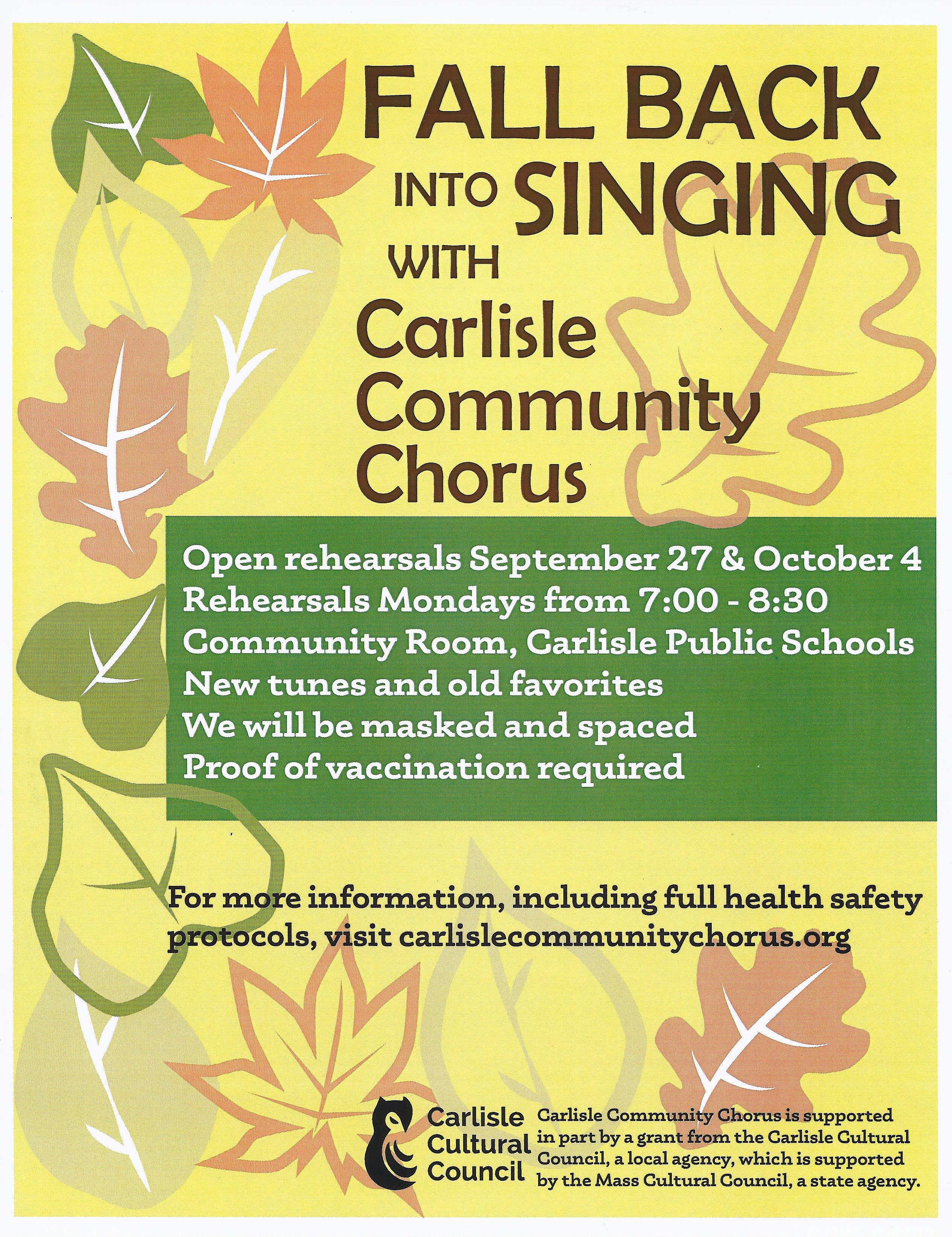 The Carlisle Community Chorus board has established a set of COVID precautions that it believes will allow us to sing safely together in person. Please review these PANDEMIC PRECAUTIONS that everyone will need to follow: